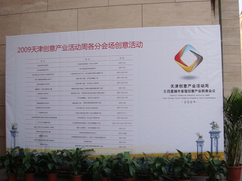 图为2009天津创意产业活动周暨四直辖市首届创意产业联席会议展牌