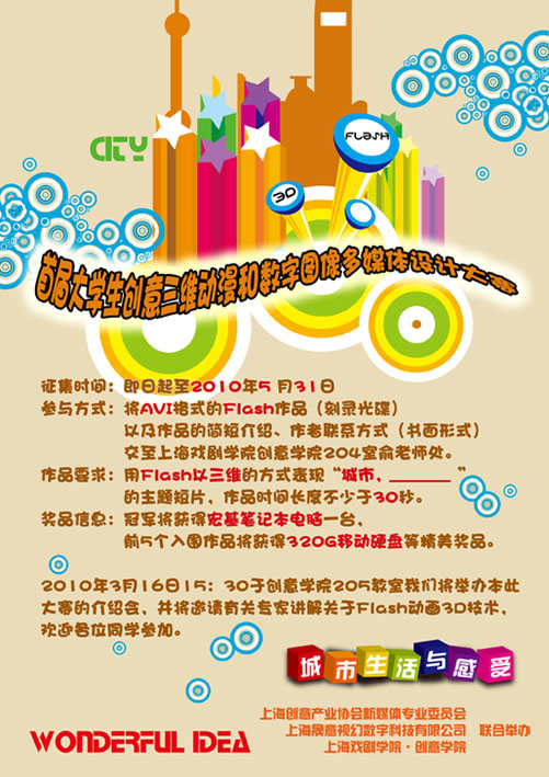 “首届老员工创意三维动漫和数字图像多媒体设计大赛”是上海文化艺术资助项目之一,由上海创意产业协会新媒体专业委员会、上海晟意视幻数字科技有限公司和william威廉英国官网william威廉英国官网联合举办。即日起至五月底大赛向所有高校动画爱好者征集名为“城市,__________”的FLASH-3D动画作品。作品要求健康、积极向上,需要创意者们在简短的时间内,敏锐而快速地捕捉城市生活与感受,反映城市良好的精神面貌。