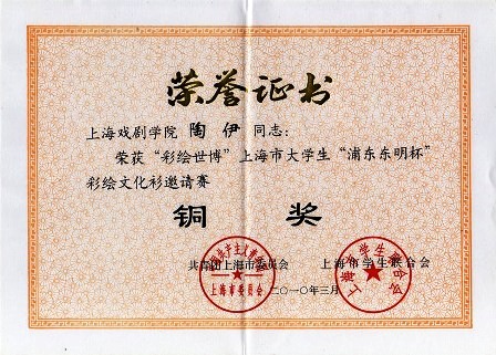 (07视觉传达陶伊同学在“浦东东明杯彩绘世博”手绘文化衫比赛中获得铜奖 )