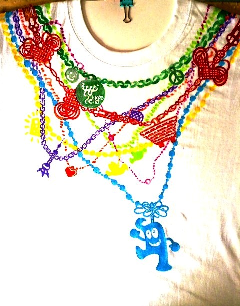 此次T恤设计结合了上海和世博会的经典元素海宝、中国馆、东方明珠...并以色彩多变的项链将这些元素结合在一起。世博会在上海举办,我们是东道主,我们在看世界,世界也在看我们。T桖的背面也点明了“城市,让生活更美好”的主题,共同分享世博盛会带来的欢乐和成果!——陶伊