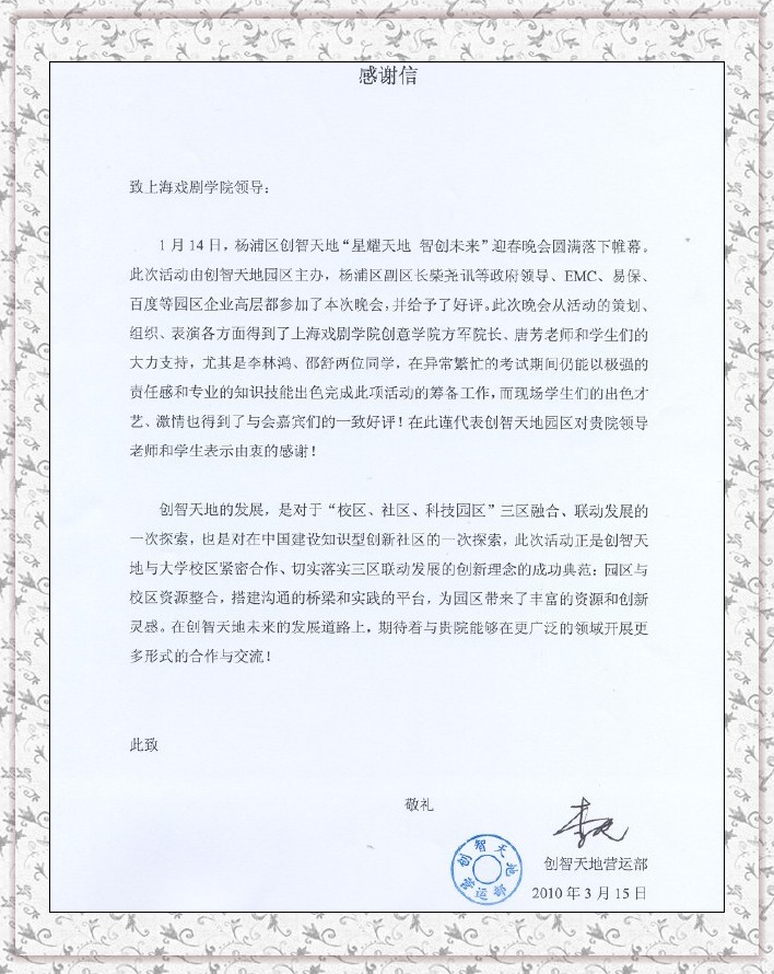 来自创智天地的感谢信