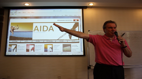 在第三次讲座中,作为奥地利布列根茨艺术节总监,David Pountney首先向我们介绍了他在布雷根茨艺术节上以音乐为特色的多部大型户外音乐活动的相关舞台美术与演出市场营销等。如:AIDA、DAS PORTRAIT、DIE PASSAGIERIN、DRCHESTER KONZERTE、IN DER FREMDE等。于此同时,他还不时向我们传达了如何运用有创意的视觉意象来达到演出宣传的最佳效应,如何让大众达到对相关音乐活动的品牌认同度等相关经验介绍。