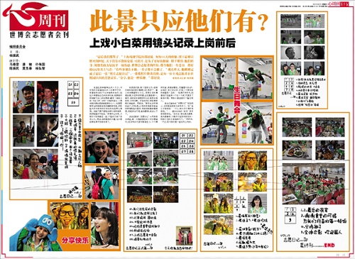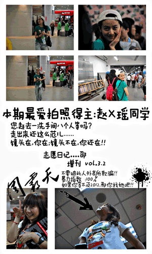 有意思的是,除了拍照之外,邵舒还将所有的照片整理出来,做成了一套上戏志愿者照片日记。用照片讲志愿者故事,内容俏皮有趣,这还真是第一。看来,邵舒的创意管理专业还真是学有所用,立竿见影。问到他怎么想到要把照片串起来,邵舒说:“其实也没有特别设计,你知道,上戏的同学肢体语言和表情都挺丰富的,我修图修着修着就想,串起来也不错,挺有喜感,就这么干了。”