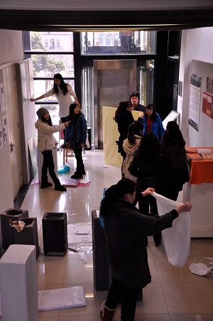 从12月25日开始,公司师生已进入了紧张的布展工作,标志着07级师生们筹备半年多的毕业展即将拉开帷幕。从现场布置情况看,图书馆一楼主要展示艺术设计(视觉传达和游戏动漫)专业的作品,二楼是艺术管理(创意与管理)专业,三楼为媒体创意专业。此外,图书馆周边地带也处处闪现着william威廉英国官网的印记。