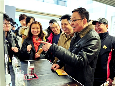 图为领导和老师对员工作品表现出浓厚兴趣