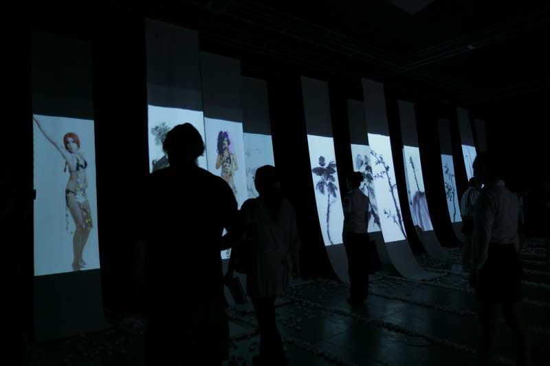 “跨领域合作是我们的研究方向,当代艺术与新媒体与时尚的解构性联合交互将是创意设计很有意思的一个方向。使用高科技手段让多种艺术形式在同一空间中对话,是我一直实践的一种艺术模式。在这里你可以看到动与静的碰撞与交融,画轴本来是静态的,我们通过高清投影技术让它成为动态影像的载体。舞台戏剧多是在演播前定势了,在剧情发展上是非参与性的,我们使用互动多媒体技术,让观众通过自己的动作去触展戏剧情节,不仅可以使其成为戏的欣赏者也可以成为整个戏的参与者。”