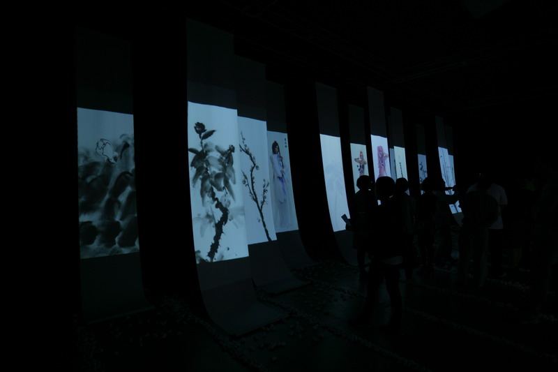 这是一次传统文化、当代艺术与高科技手段跨领域的戏剧化碰撞。凌空悬挂的十二幅国画卷轴排列成画轴矩阵,代表了宝钗、黛玉、熙凤、探春、妙玉等十二位美丽的红楼金钗。画面在素雅的水墨丹青、古典的艳妆华服、动感的cosplay三种强烈对比的元素中交叠。更奇妙的是,整个展项中,观众的参与成为触发展项的关键,它像是一幕绚丽的舞台剧,等待观众经由红楼故事在古典与现代的时空交错中穿越。