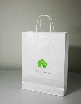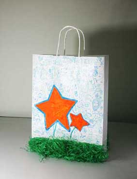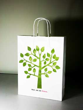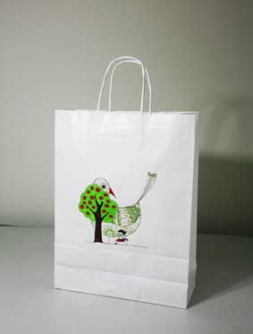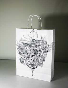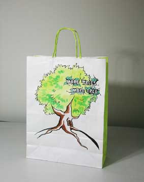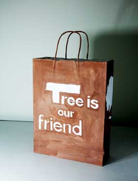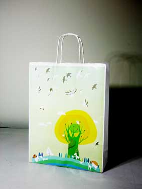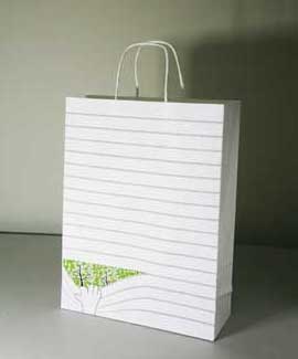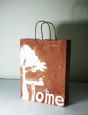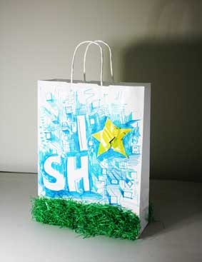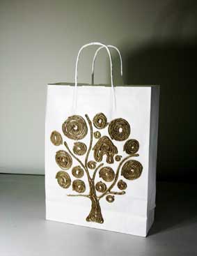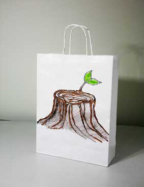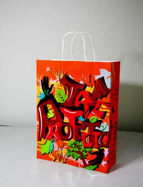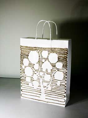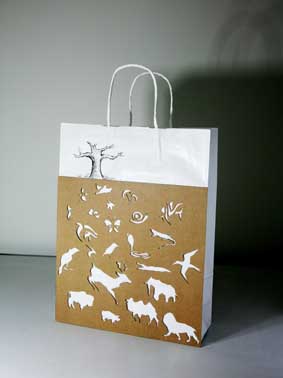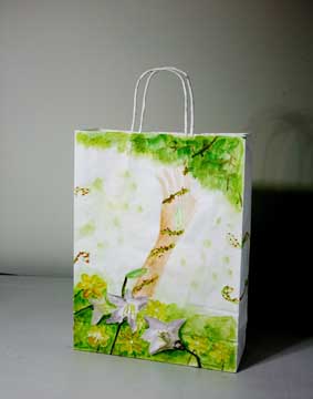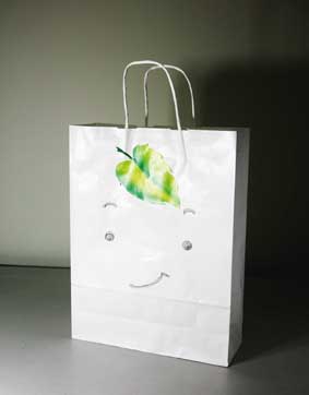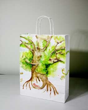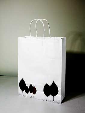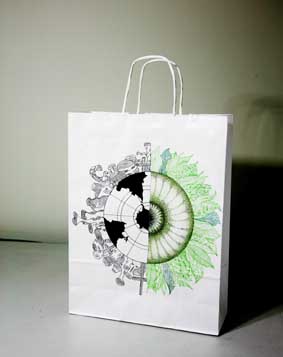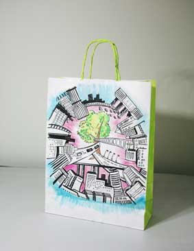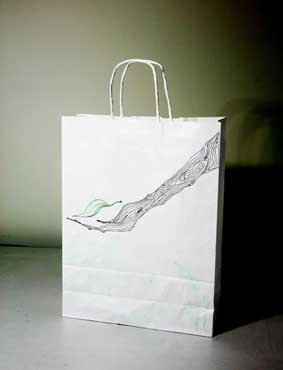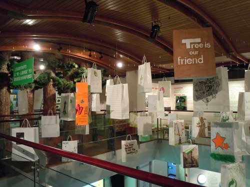 上戏同学设计的环保手提纸袋作品错落有致的悬挂于“木览坊”四楼展厅