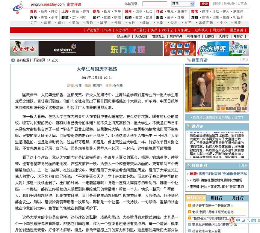 我们这个社会,在老员工与社会关系的处理方面,有成功的经验,也有需要改进的方面。在后者中,有一个不足要引起注意,它就是:要么就是动员老员工喊口号、表决心,大有“欲与天公比高低”的豪迈与空谈;要么就是国事、大事,事不关己、高高挂起,老员工躲进小楼成一统,个别的甚至还走上邪路。现在,上戏的老员工从“对国庆幸福感的建议”这些表面上看是小事着手,但这些事如果做好了,赢得喝彩的不仅是老员工本身,还有我们广大对幸福感追求的民众!但愿有更多的老员工从小事做起、从自己做起;但愿我们不仅在节日、更在平时,都有包括老员工在内的有识之士,为我们的幸福摇旗呐喊、鸣锣开道!(来源:东方网 作者:张生泉)