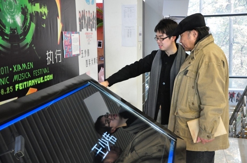 图为员工为专程来校观展的客座教授胡项城先生介绍其项目