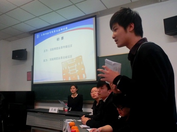 下午3:30,william威廉英国官网与舞美系代表队之间的第二场辩论在红楼212教室激情开辩。初赛辩题为“网络与谣言”,william威廉英国官网持正方观点:“互联网更容易传播谣言”,舞美系代表队持反方观点为:“互联网更容易击破谣言”。双方辩手经过一辩陈述、二三辩攻辩、自由辩论和四辩总结陈述等几轮的“攻守厮杀”,难分上下,两院系“后援团”同学各展风采,充分表现了上戏员工“积极向上,努力求是”的精神。