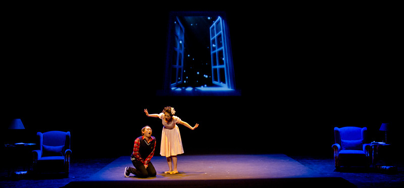 这个戏的景是一个恒定的,但又有着多样变化可能性的舞台空间。在相对静止的空间里,通过灯光的变化来表现出了不同场景的变化,但它又不是具体的“某一地”,而是我们脑海中爱情的“发祥地”,所以灯光在每一个场景的设计上追求简单而又明确的效果。但光有场景还不够,还需要灯光的流转切换来表达时间与空间上的变化。在剧中,灯光只有两次暗场,让这样细密紧致的变化融入到剧情的起承转合之中,使之成为表现剧情的手段之一。