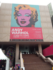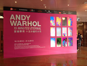 为庆祝香港特别行政区成立十五周年,至2013年3月底,由康乐及文化事务署及安迪•沃霍尔美术馆联合主办,香港艺术馆合作筹划的《安迪.华荷:十五分钟的永恒》展在香港艺术馆举办。主展区分为1950s 人在纽约、1960s工厂时代、1970s闪亮星光、1980s人生苦短、时间囊和电影六个区域。四百六十八件来自美国安迪•沃霍尔美术馆的手稿、摄影、绘画、丝网印刷、电影、录像及生活用品等藏品一一呈现,让我们可以通过时间和空间的推移来认识这位叱咤风云的艺术大家的成长和一生。