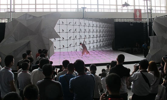 上戏虚拟实验室此次赴京参展的作品,有新媒体舞蹈诗《文明图腾》、《四季》、《极境》,新媒体音乐剧《弘一法师》,新媒体话剧《爱情书简》,新媒体诗剧《追梦中国》,建筑灯光投影《乐舞百戏》等,皆为实验室艺术性、实验性较强的代表性作品。为了充分显示新媒体演艺的艺术形式和独特魅力,虚拟实验室的各个展台均采用了模型与新媒体投影相结合的方式,同时配以精心剪辑的演出音视频,以动与静的有机交融为观众营造了身临其境的艺术体验。此外,由上戏舞蹈公司员工表演的新媒体舞蹈诗《文明图腾》和《极境》片段,每天还在现场进行三场展示,吸引了大量观众前来观看,并从中进一步了解了演员肢体与新媒体语汇如何实现交互。上戏虚拟实验室作品富有冲击力的全方位、立体式呈现,使其在2014中国舞美创意show中备受瞩目。