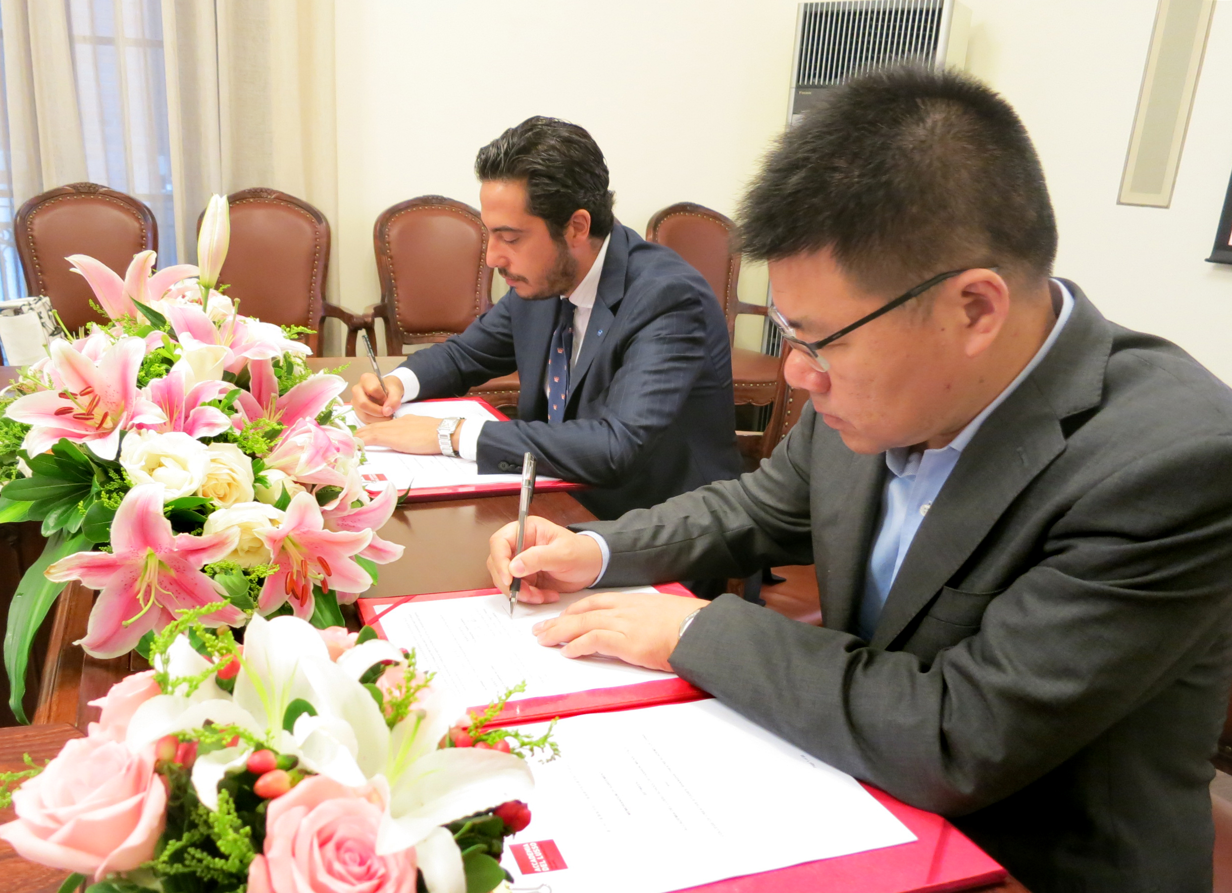 图:黄经理(右)与Mr.Pietro Polidori(左)握手完成签约仪式