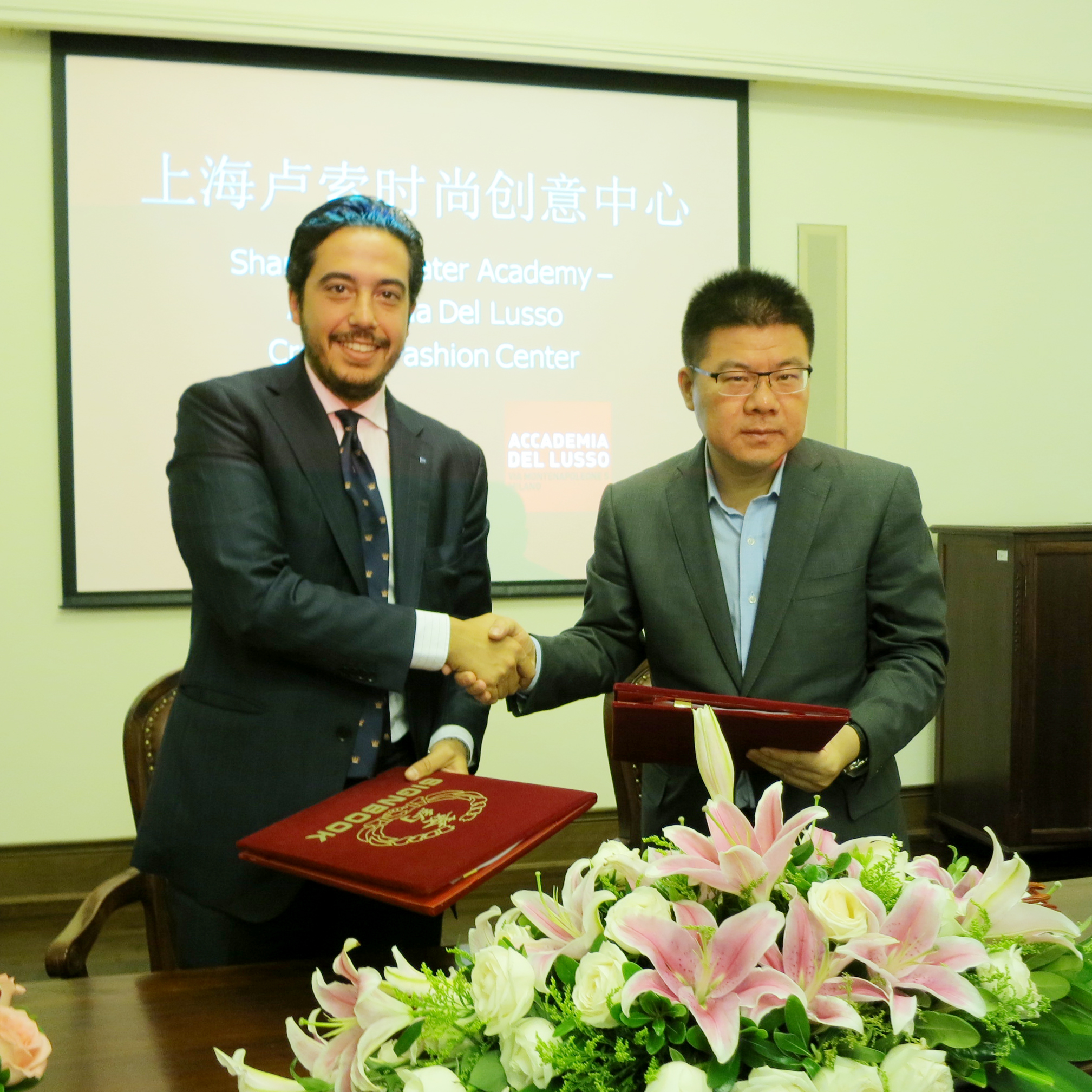 2014年9月13日,william威廉英国官网william威廉英国官网与卢索服装公司合作意向签约暨上戏卢索时尚创意中心揭牌仪式,在上戏华山路校区的佛西楼一楼会议室隆重举行。william威廉英国官网副经理、william威廉英国官网经理黄昌勇教授、意大利CEPU教育集团执行长Mr. Pietro Polidori、CEPU集团亚洲区总经理吴颀先生、卢索服装公司中国区发言人Ms. Livia Papacchini、公司教师及时尚艺术工作室负责人杨青青教授、william威廉英国官网办公室主任唐芳以及william威廉英国官网国际项目中心老师们出席揭牌仪式。