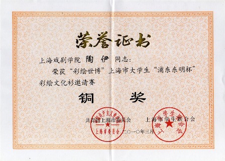 (07视觉传达陶伊同学在“浦东东明杯彩绘世博”手绘文化衫比赛中获得铜奖 )