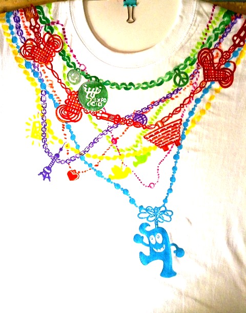 此次T恤设计结合了上海和世博会的经典元素海宝、中国馆、东方明珠...并以色彩多变的项链将这些元素结合在一起。世博会在上海举办,我们是东道主,我们在看世界,世界也在看我们。T桖的背面也点明了“城市,让生活更美好”的主题,共同分享世博盛会带来的欢乐和成果!——陶伊