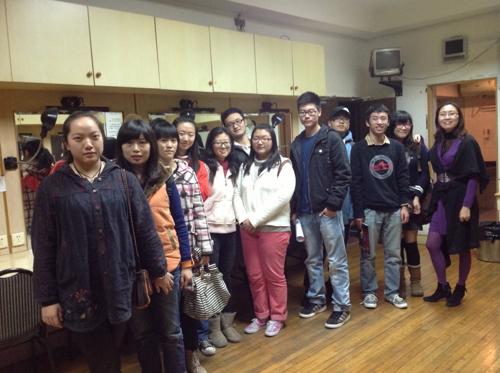 图为12艺术管理全班同学及郭老师在上海话剧艺术中心化妆间合照