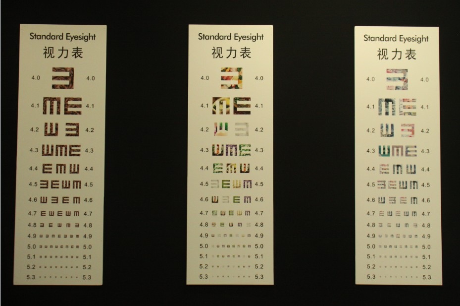我在创作作品《视力表》时,也同样背负着这样的心理压力。作品强调的是物质世界中,人的欲望。生活中形形色色的材质代替不同类型的欲望,融入到视力表这个载体中。观众看到的不仅是视力表,更是“视利表”。一副视力表,121E的符号,我需要选取上百种不同颜色不同质地的材质,纯手工贴在亚克力底板上。这不仅要考验我的耐性更要考验我的实际操作能力。