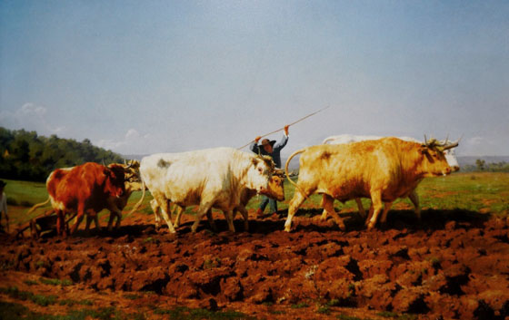 而我感触最深的则是《尼维尔内的犁耕》,它给我带来了巨大的震撼!这幅画是由法国女画家罗萨-博纳尔 在1849年所做,可以说是一幅动物题材的巅峰之作。几头耕牛耕地的形状动态被刻画得栩栩如生,活灵活现。中间一头牛的右眼狠狠一瞪,似乎很不情愿受主人驱使耕田,非常生动传神。牛鼻子呼出的热气,白牛身上巧妙的颜色……在以往画册中,这些都显得模糊许多。