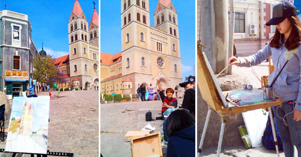 早上8点,班里的同学早早就出发去写生。在青岛最有名的基督教堂前我们摆开阵势,开始习作的绘制。尽管青岛的风十分大,但我们画画的热情却并未因此减少,同学们都认认真真地画了一整天,期间有不少游客和市民驻足观赏,还有人愿意出钱来买我们的画,令我们兴奋不已。