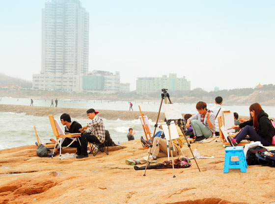 拍完合照和狂喜之后,我们开始找定自己感兴趣的角度,在礁石上感受大海的气息,排除所以杂念,让自己的心静下来,画出自己的画。每个人都洋溢着自信,尽情地挥洒。好多游客都来围观欣赏我们的画,听到好评每个人心里都喜滋滋的。画了一会,突然浪大了,海花拍打着礁石出现了层层浪花,很美丽,浪花像是活了一样,像一个舞者,我们之前画的一些礁石已被浪花淹没。面对大海激动的心情,使我们自始至终都很有作画的冲动,这个冲动引领着我们挥舞笔刷。