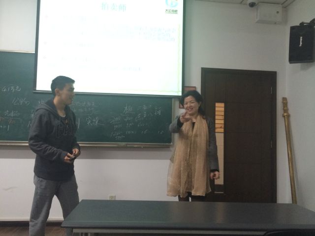 更有趣的是在讲到考拍卖师从业证书要考四门课。其中一门是实操,。老师拿出自己的槌子让同学们体验一把做拍卖师的感觉。台下的人不断叫价,直到最后一槌定音“成交”,整个过程十分欢乐。