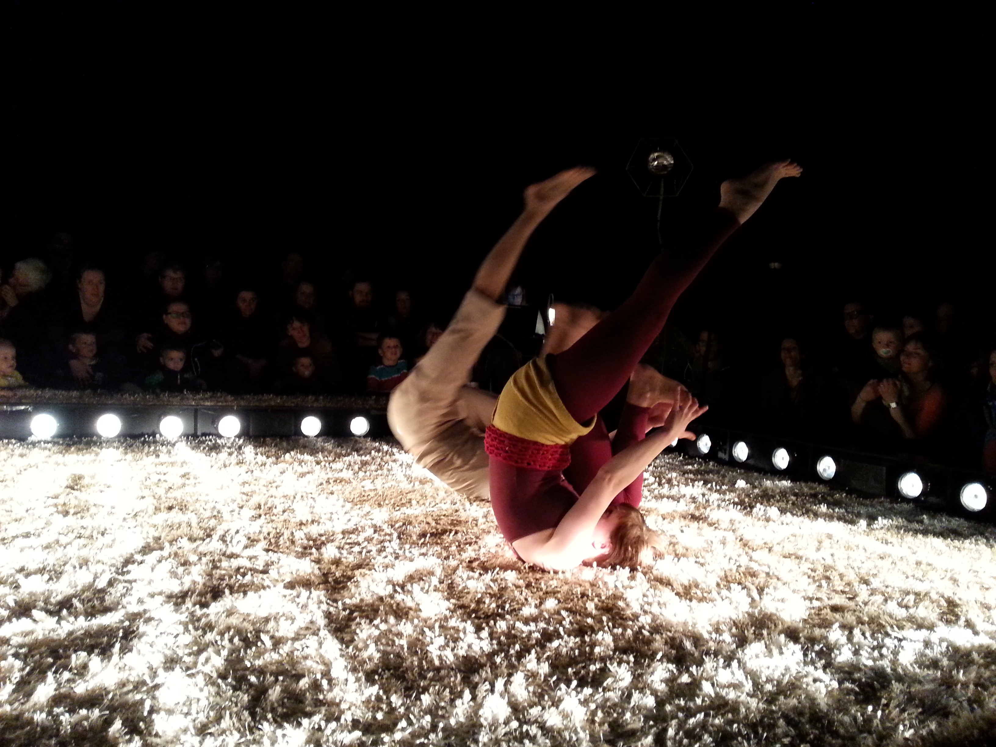 因为特殊的观众群,所有人都脱鞋进入剧场观看,而场内的地上更是铺上了柔软厚实的地毯。一男一女两个舞者台词仅有一句「igen」,没有具体的情节,舞蹈的动作极为柔软缓慢,又穿插了一些这个年纪的宝宝常做的肢体游戏动作,很好的照顾到宝宝们的感观。暖黄色的弱光不时的闪烁在舞台的各个角落,轻柔的音乐适时的响起,让宝宝们不至于哭闹或是睡着。