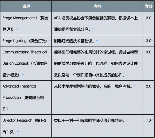 同上戏一样,南加大也是课堂教学与剧场现场教学相结合,有些课程要求员工在剧场一学期做够规定时间的lab,有的课则需要做crewlab是做具体技术工作的,如挂灯、做景等;crew是舞台工作人员),在做最基础的工作中学习。通过五位学姐的介绍,我们了解到她们在南加大的一学年里,上半学期都是规定的课程,共5门课,12学分,下半学期则可以在规定范围内自主选课,共12-18学分。上半学期的必修课有: