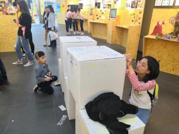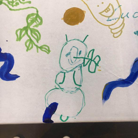 连续三次观展的小朋友奇奇模仿动画作品《毛虫危机》,自己绘制了片中的毛毛虫这一角色