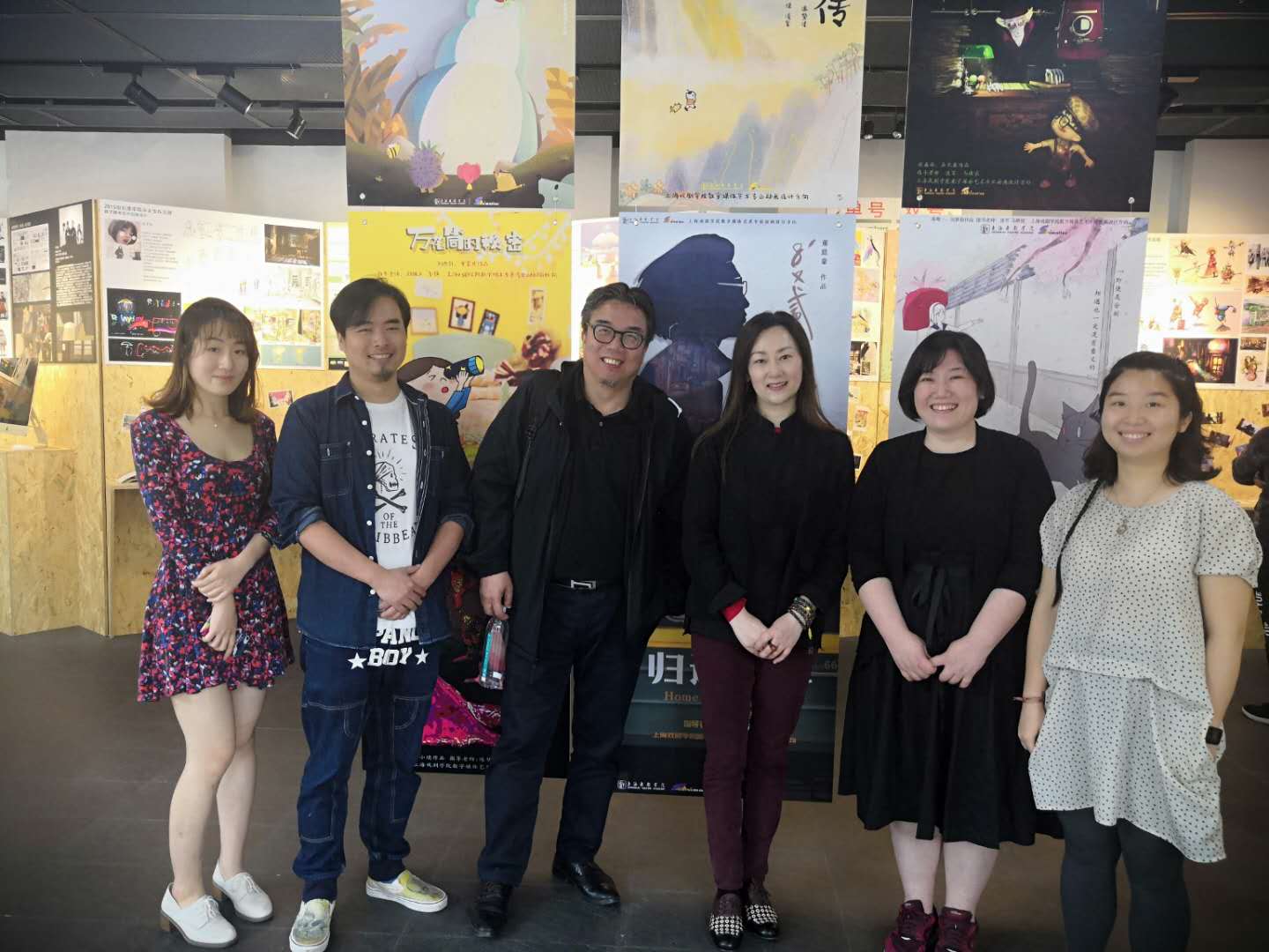 上海美影厂厂长速达、副厂长王华强、苏州红鲤动画公司CEO戈弋同指导教师合影