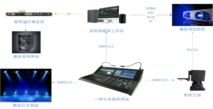 一、 新媒体剧场一体化控制系统 1.1舞台灯光和设备的一体化智能控制系统:实现利用音频播出设备控制音响和灯光的同步功能;各幕布背景间焦距的切换达到在10 秒内完成调整。 1.2智能投影机云台:设计可自由控制投影仪吊顶式悬挂和桌面放置模式的可通过控台控制的智能控制云台一台,并具备快门开关等功能,提供水平方面调角度的功能:建立可扩展,可通过DMX 信号或网络信号与灯光、音频等装置集中控制。 1.3、录音机设备的研发:支持实现时间码的实时输出,将音频输出的信噪比高于 50dB(国标 GY/T 152-2000)、音频接口抖动率低于 0.07UI(国标 GY/T 158-2000)。