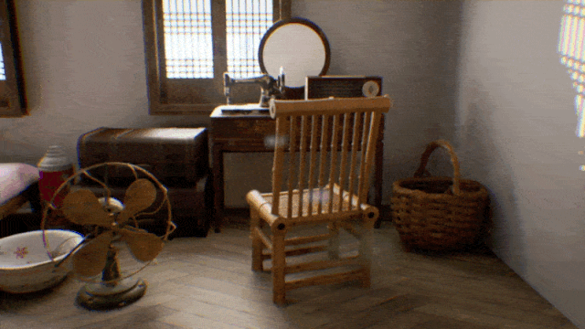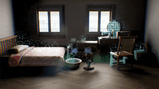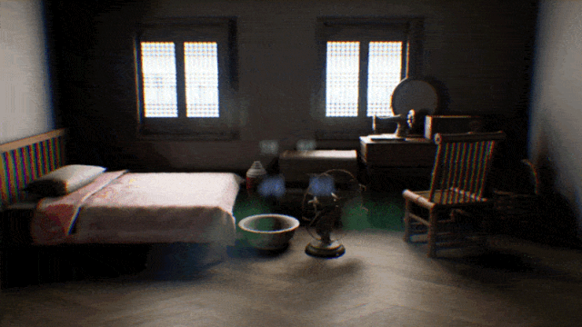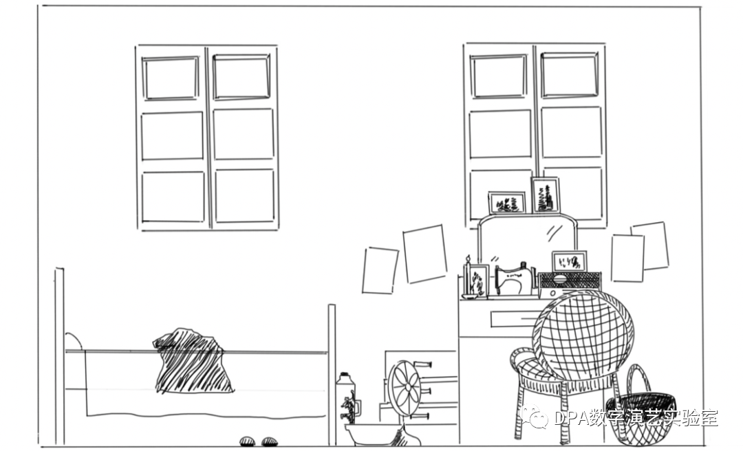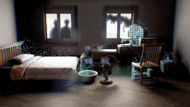 以淡入网格、粒子消散的视觉效果,营造物理装置正在“消失”的视觉幻觉。让观众感受纺织女工的生活空间“正在”消失。也通过这样的形式来隐喻纺织女工的历史与我们的生活渐行渐远,逐渐被人们淡忘。增加物理装置空间的不稳定性和虚拟性。在装置空间中投射纺织女工的工作照、生活照、以及越剧剧照来交代故事内容背景。