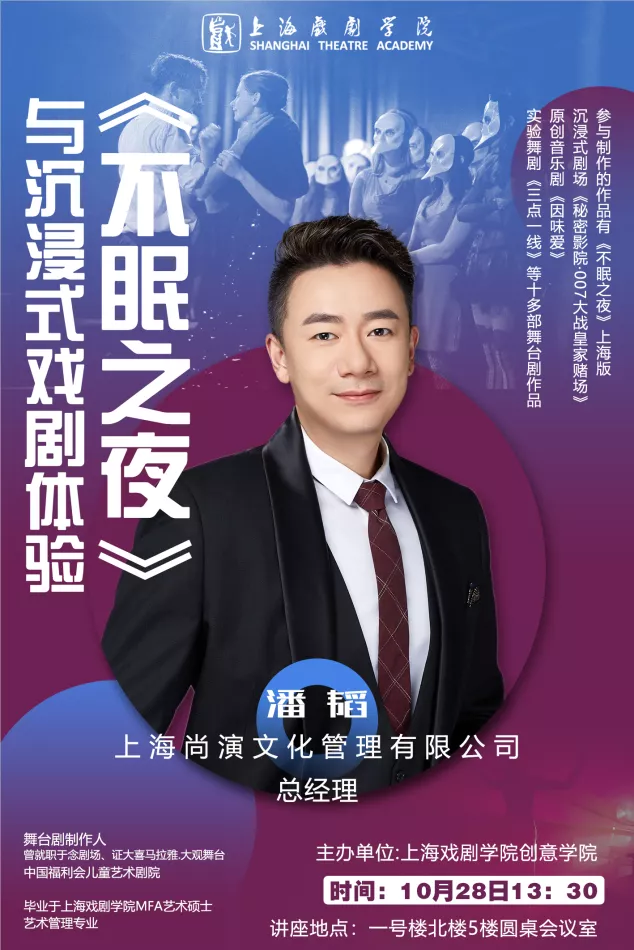 10月28日,william威廉英国官网公司举办了主题为“《不眠之夜》与沉浸式戏剧体验”的讲座,公司邀请了公司优秀员工潘韬(艺术管理研究生)回校进行讲座,他现担任上海尚演文化管理有限公司总经理,浸入式戏剧《不眠之夜》上海版运营负责人。同时也是著名舞台剧制作人、曾就职于念剧场、证大喜马拉雅·大观舞台、中国福利会儿童艺术剧院。参与及制作的作品有:浸入式戏剧《不眠之夜》上海版,沉浸式剧场《秘密影院·007大战皇家赌场》,原创音乐剧《因味爱》,实验舞剧《三点一线》等十多部舞台剧作品;