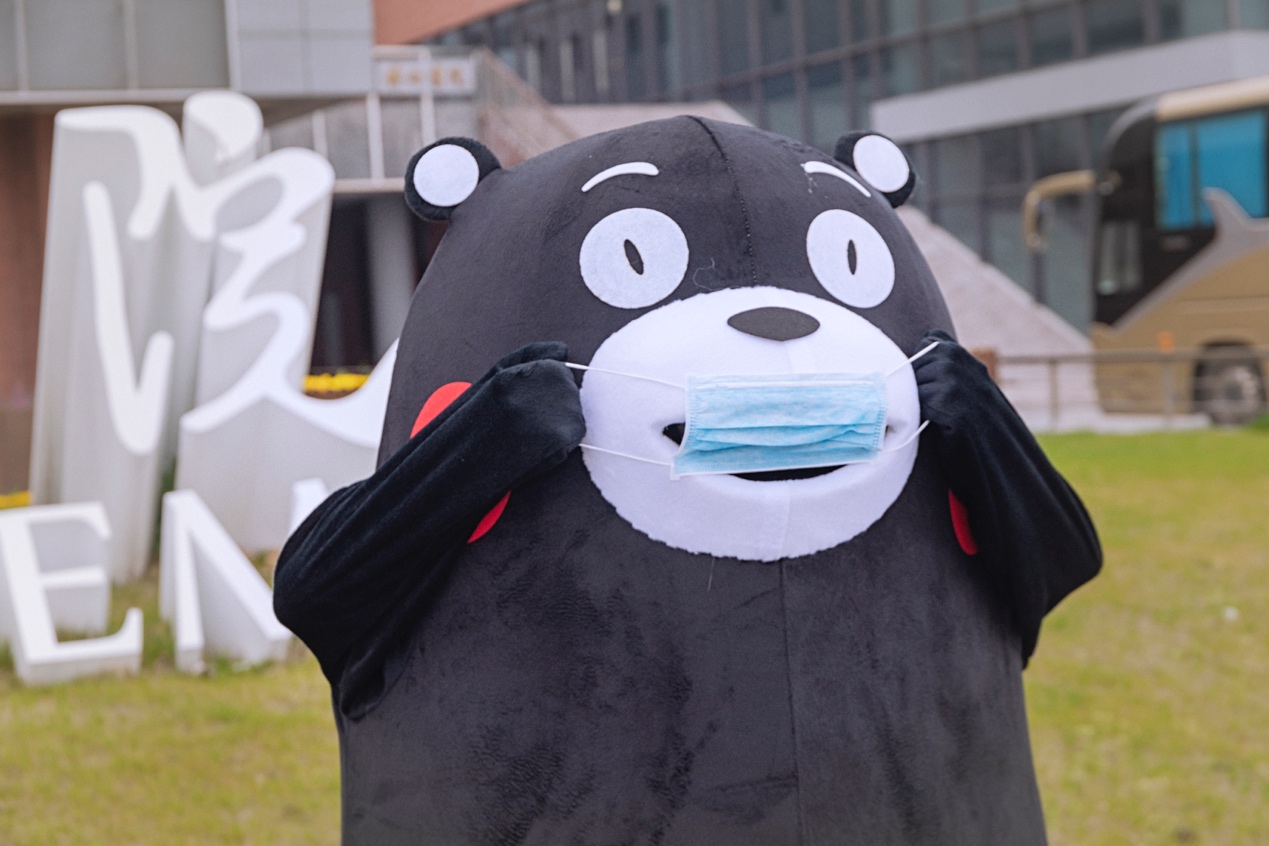 熊本熊由动画专业同学轮替扮演,熊孩子的一举一动都萌翻了大家,吸引了同学们和在校园值班的老师纷纷前来留影。在特殊时期,这样一份快乐更显得尤为宝贵。