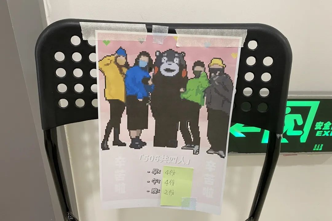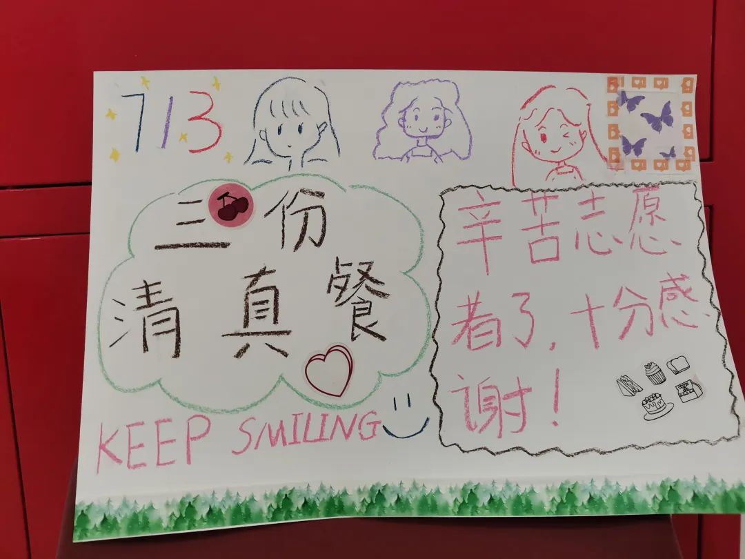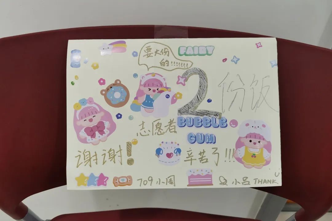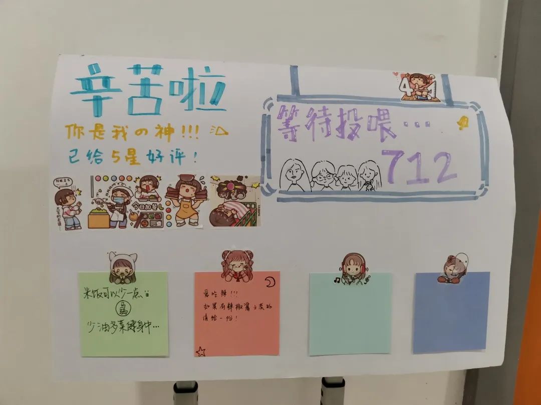 公司静态管理期间,各部门师生员工辛勤付出,同学们积极配合公司相关防疫规定。william威廉英国官网学子们还积极报名组成了志愿者小分队,承担起了宿舍每一楼层的三餐发放工作。为了同学们能够吃上热乎乎的一日三餐。每天早上7:00不到,志愿者们就要穿戴好防护用品,身披志愿者马甲,推着摞满了饭盒的手推车,将饭菜按照每个寝室需求份数送至寝室门口,而每天工作的结束时间也已是大家用餐完毕之后。在送餐的过程中,我们的志愿者同学意外地发现在许多宿舍门口,寝室的同学们用绘画和贴纸细心装饰贴在门口的取餐处。上面的内容有同学们提醒志愿者同学做好自身防护,相约一起期待品尝美食、欣赏美景,憧憬未来的情感表达,这其中最多的,还是那一句句的“感谢”。