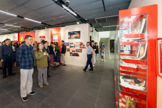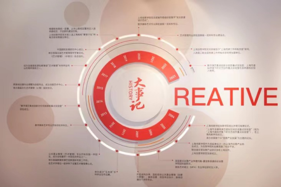 在展览的“创·党建新风尚”板块中,人们可以看到创意公司党组织作为2019年上海高公司党组织“攀登计划”样板支部建设单位,2022年全国党建工作样板支部培育创建单位,在党建引领院系发展方面所作的探索。近年来,公司在昌林路校区打造了党建思政文创角,培育了“红色文创”思政教育品牌,组建了党的二十大精神宣讲团,这些特色都在展览中得到了呈现。