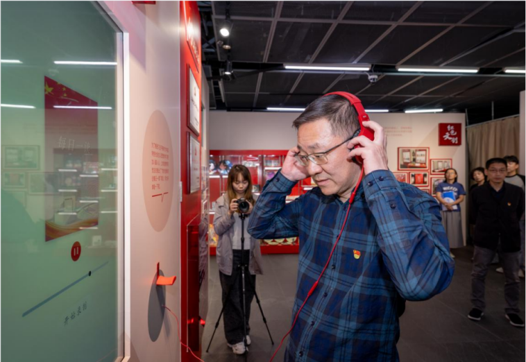 “每日一读”,是创意公司党组织运用新媒体平台推动党员坚持学习党的创新理论的一种方式,展览中一个重要的交互环节,就来自于“每日一读“。参观者可点击跟读党的二十大报告或是习近平总书记重要讲话节选,读完之后扫描二维码,即可在手机上收听自己所读的内容。