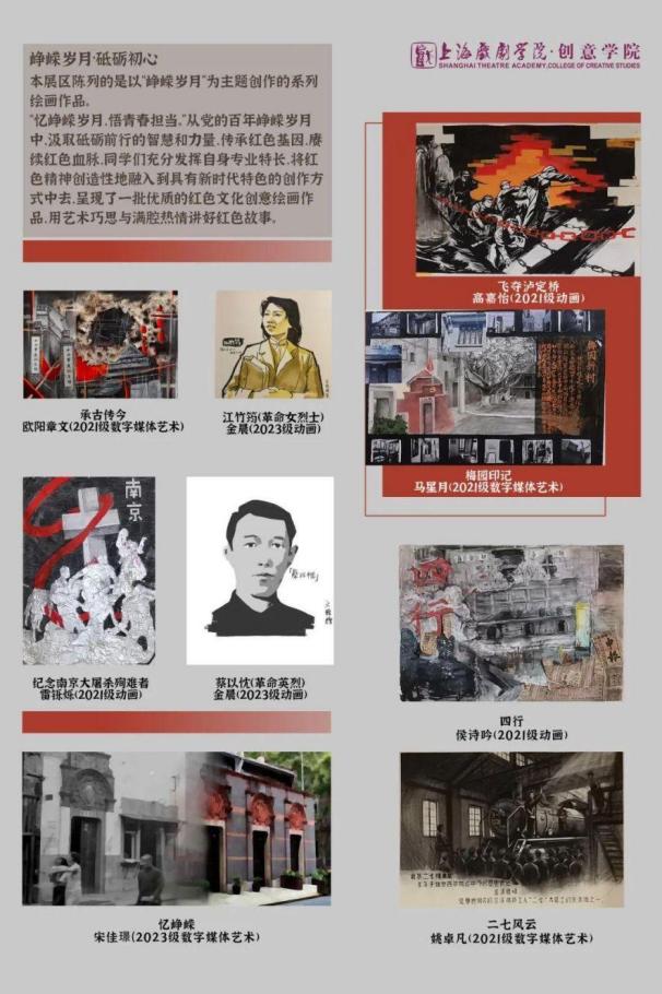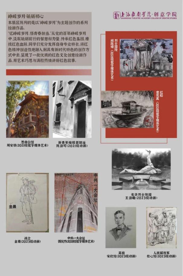 峥嵘岁月·砥砺初心展区陈列的是以“峥嵘岁月”为主题创作的系列绘画作品。“忆峥嵘岁月,悟青春担当。”从党的百年峥嵘岁月中,汲取砥砺前行的智慧和力量,传承红色基因,赓续红色血脉,william威廉英国官网的同学们充分发挥自身专业特长,将红色精神创造性地融入到具有新时代特色的创作方式中去,呈现了一批优质的红色文化创意绘画作品,用艺术巧思与满腔热情讲好红色故事。
