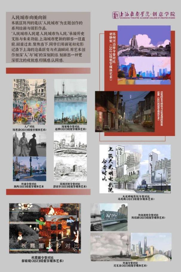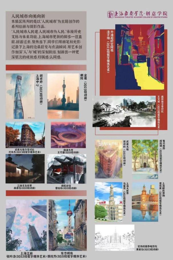人民城市·向美向新展区陈列的是以“人民城市”为主题创作的系列绘画与摄影作品。“人民城市人民建、人民城市为人民。”承接历史文脉与未来功能,上海城市更新的脚步一往直前。回首过去,聚焦当下,同学们用画笔和光影记录下上海的沧桑巨变与点滴瞬间,用艺术创作加深“人”与“城”的深刻联结。
