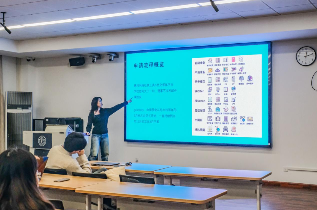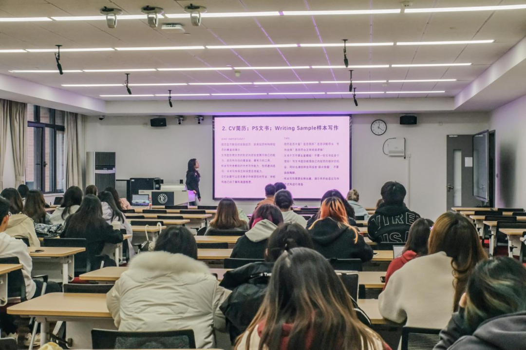 宋盈盈首先介绍了国外大学的申请流程及需要准备的材料,她建议大家从现在开始思考自己的未来方向,并鼓励同学们们以热爱和内心的想法为导向,综合多方因素选择自己的下一步计划。她提醒同学们在学习生活中保持健康的心理状态,遇到困难时可以多与前辈沟通交流,确立好自己的目标规划,希望大家在未来的学业中找到自己的心之所向。