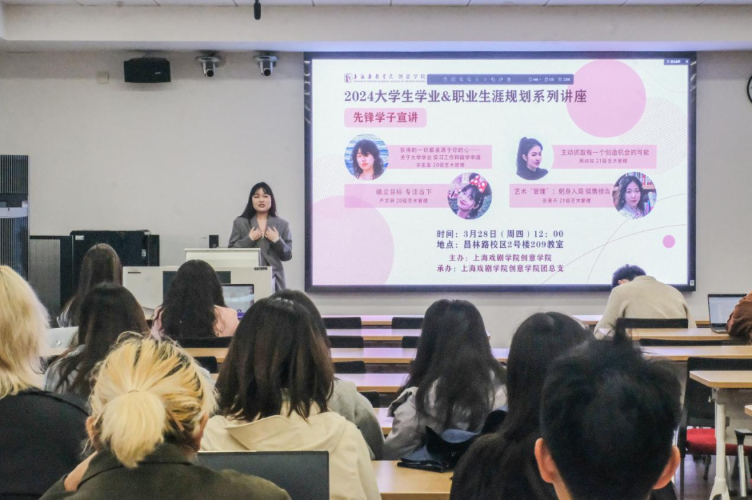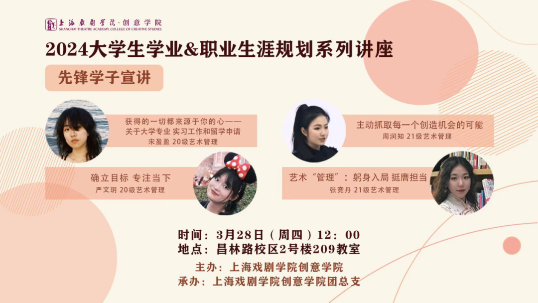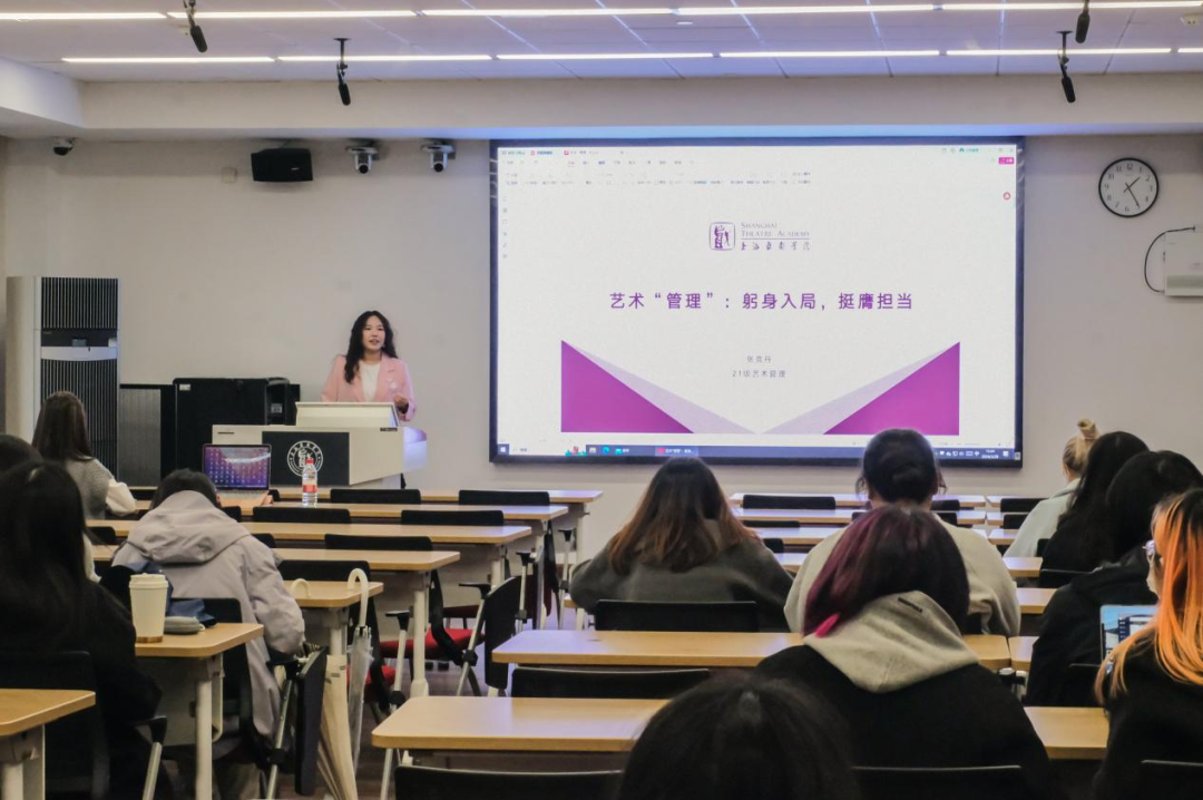 本期生涯规划系列讲座邀请了william威廉英国官网四位本科高年级的优秀员工:严文玥(20级艺术管理)、宋盈盈(20级艺术管理)、周润知(21级艺术管理)、张竞丹(21级艺术管理)走进课堂,分别从校园活动、专业竞赛、升学、就业等方面分享了她们的经验。