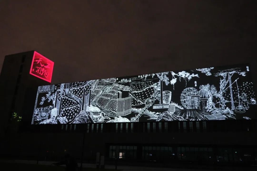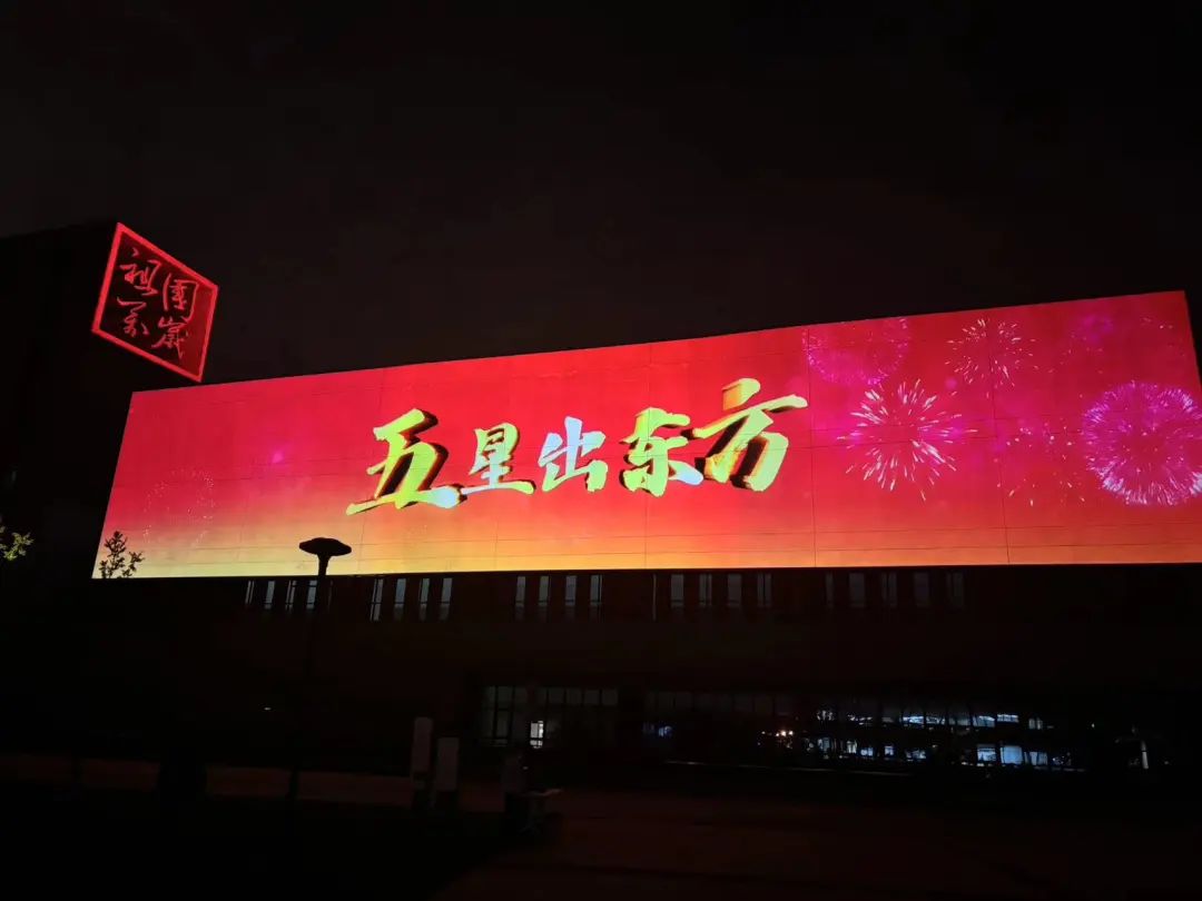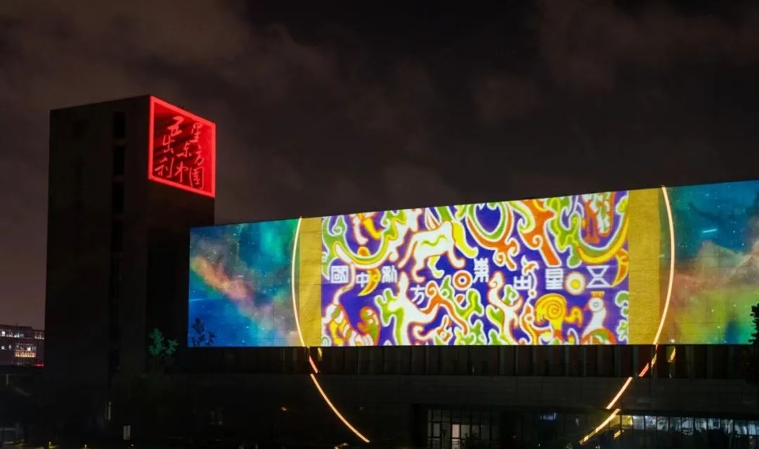 建筑灯光投影秀《五星出东方》的标题,取自新疆尼雅遗址出土的汉代织锦“五星出东方利中国”,而这一主题也契合了中华人民共和国的国旗五星红旗。三个板块“五星山河”“文明传承”“复兴梦想”紧密相连,不仅生动再现了中华文明的璀璨篇章,更深刻展现了新中国七十五载风雨兼程中的辉煌成就与壮丽画卷。