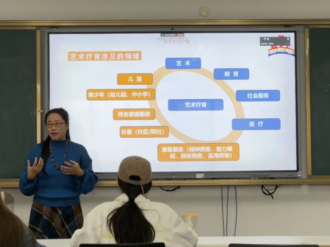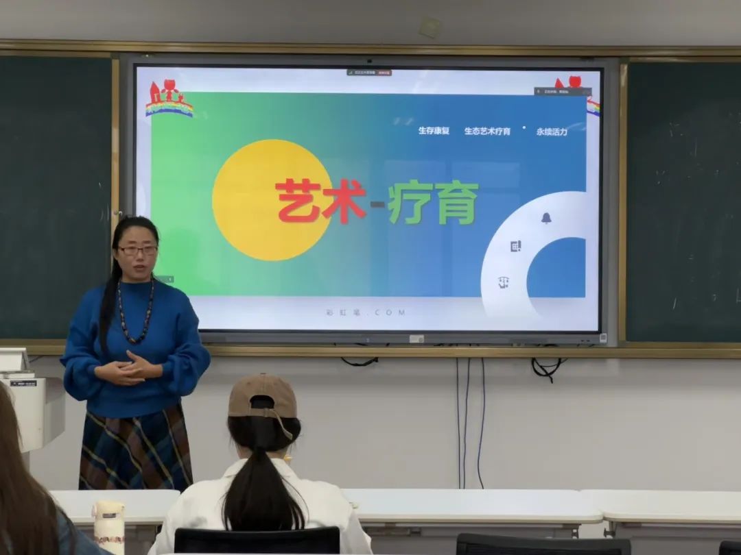 在本次讲座在线上线下同步开展,王兰老师深入阐述了艺术疗育的深远意义及其对特殊群体的积极影响,特别强调了艺术疗育对同学们个人成长和社会实践的重要性。
