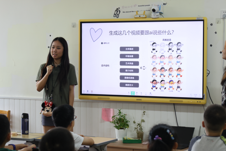 课堂伊始,计于翕同学以“逢7拍手”互动游戏点燃现场气氛,让孩子们在欢声笑语中迅速进入状态。破冰之后,团队播放了AI生成的儿童牙齿健康动画视频,生动直观地阐释了口腔护理的重要性。紧接着,赵桐和陆思涵同学用通俗易懂的语言,为孩子们揭秘了AI绘图的工作原理与常用工具,将“AI能画画”这一前沿概念融入孩子们的认知视野。