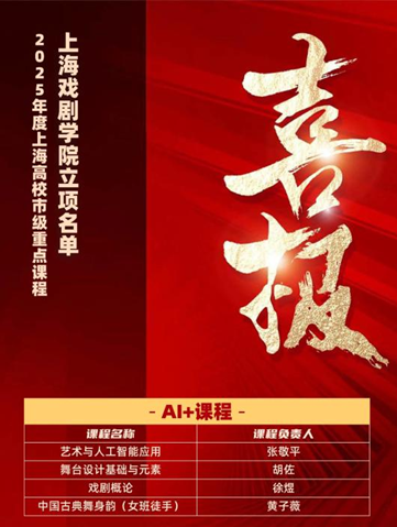 《艺术与人工智能应用》(课程负责人:张敬平教授)荣获2025年度上海高校市级AI+重点课程立项,标志着公司在“艺术+科技”通识教育领域再添一门重点课程。本课程既是面向本科一至四年级的全校通识课,又是公司的院系选修课程。该课程自2021年9月开设以来,已完成四轮迭代,它以“技术逻辑与艺术表达”双轮驱动,打通了AI工具链、XR平台与传统文化资源,为后续《演艺新媒体交互设计》《戏剧与交互设计》等“AI+”专业课程奠定了扎实基础,并在竞赛、教材、产学研多个维度开花结果。