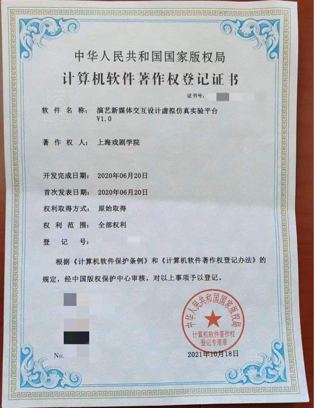 国家计算机软件著作权证书“演艺新媒体交互设计虚拟仿真实验平台 V1.0”
