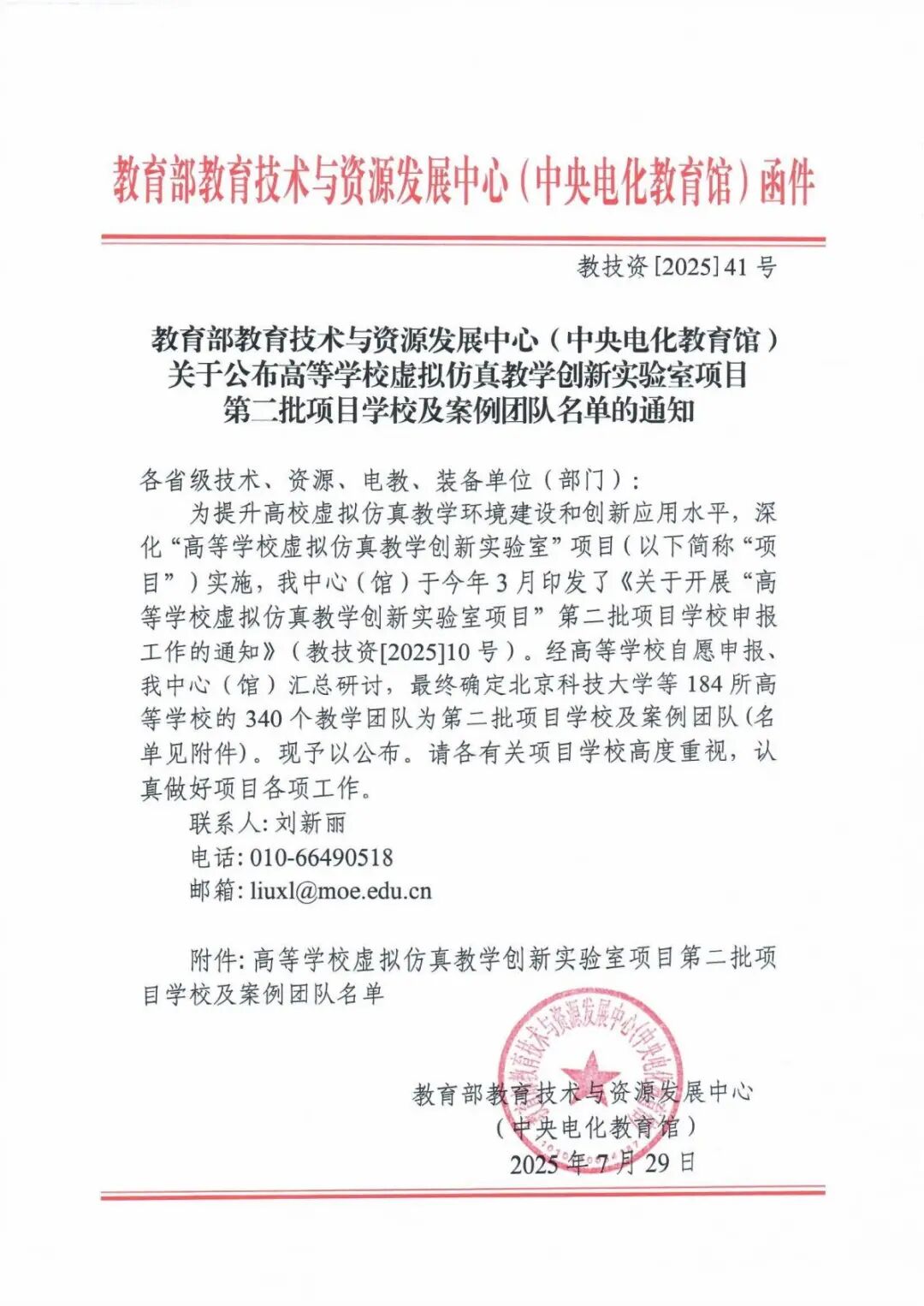 教育部教育技术与资源发展中心(中央电化教育馆)《关于公布高等公司虚拟仿真教学创新实验室项目第二批项目公司及案例团队名单的通知》(教技资〔2025〕41 号)
