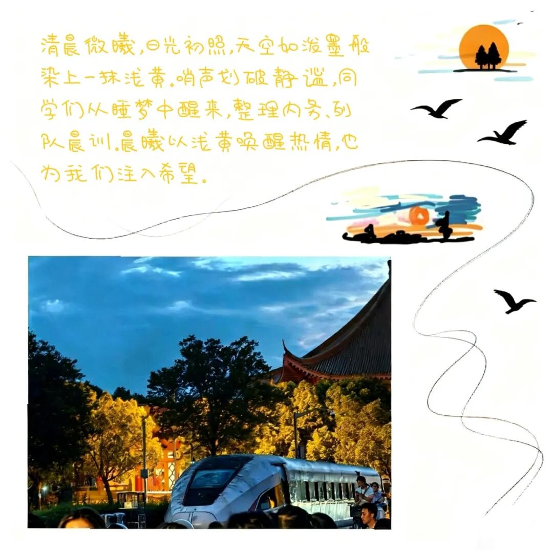 回顾军训历程,从破晓时分的晨光初现,到夕阳西下的霞光满天,艺科艺管学子用汗水调绘出青春最绚丽的色彩。松枝绿勾勒出挺拔脊梁,海军蓝映照着纪律意识,救护白诠释着生命敬畏。数字媒体艺术专业的同学们充分发挥专业特长,用画笔和AI技术记录下这段珍贵时光,将军训体会转化为创意作品。